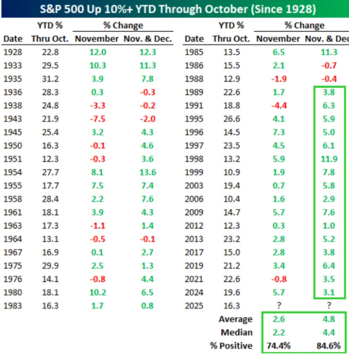 历史数据显示,在过去30年里,11月历来是美股一年里表现最好的月份。同时根据Bespoke投资集团的统计,自1928年以来,标普500指数在前十个月上涨超过10%的情况已经发生40次。在今年之前,每当出现这种情况,11月份的平均涨幅为2.6%。
